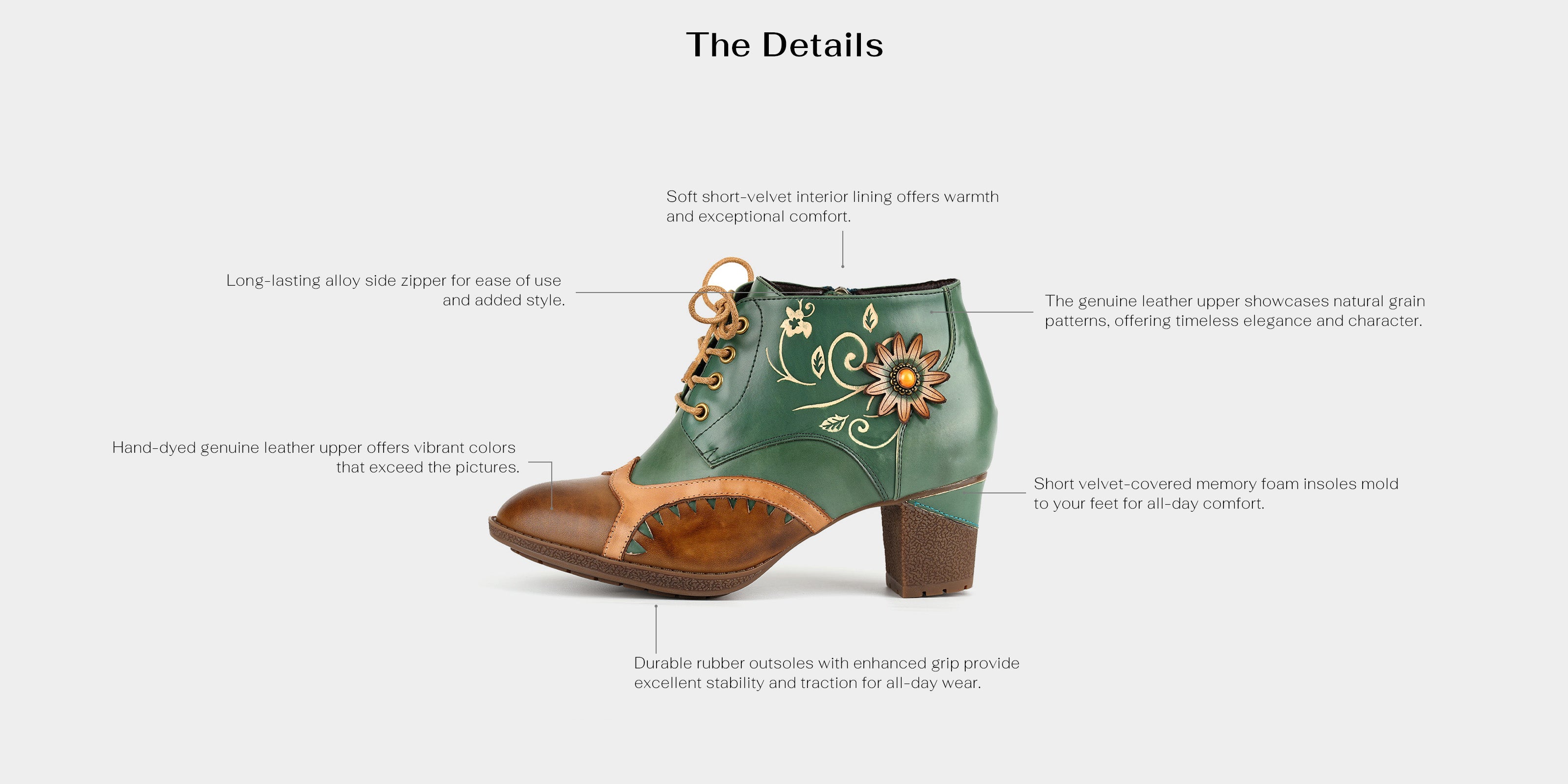 These boots blend earthy elegance with playful charm, featuring hand-painted florals, bold stitching, and a cheerful sunflower ornament. The lace-up front and side zipper ensure a secure fit and convenience, while the mid-height block heel adds comfort. Ideal with jeans or dresses, they offer rustic sophistication and artistic flair.