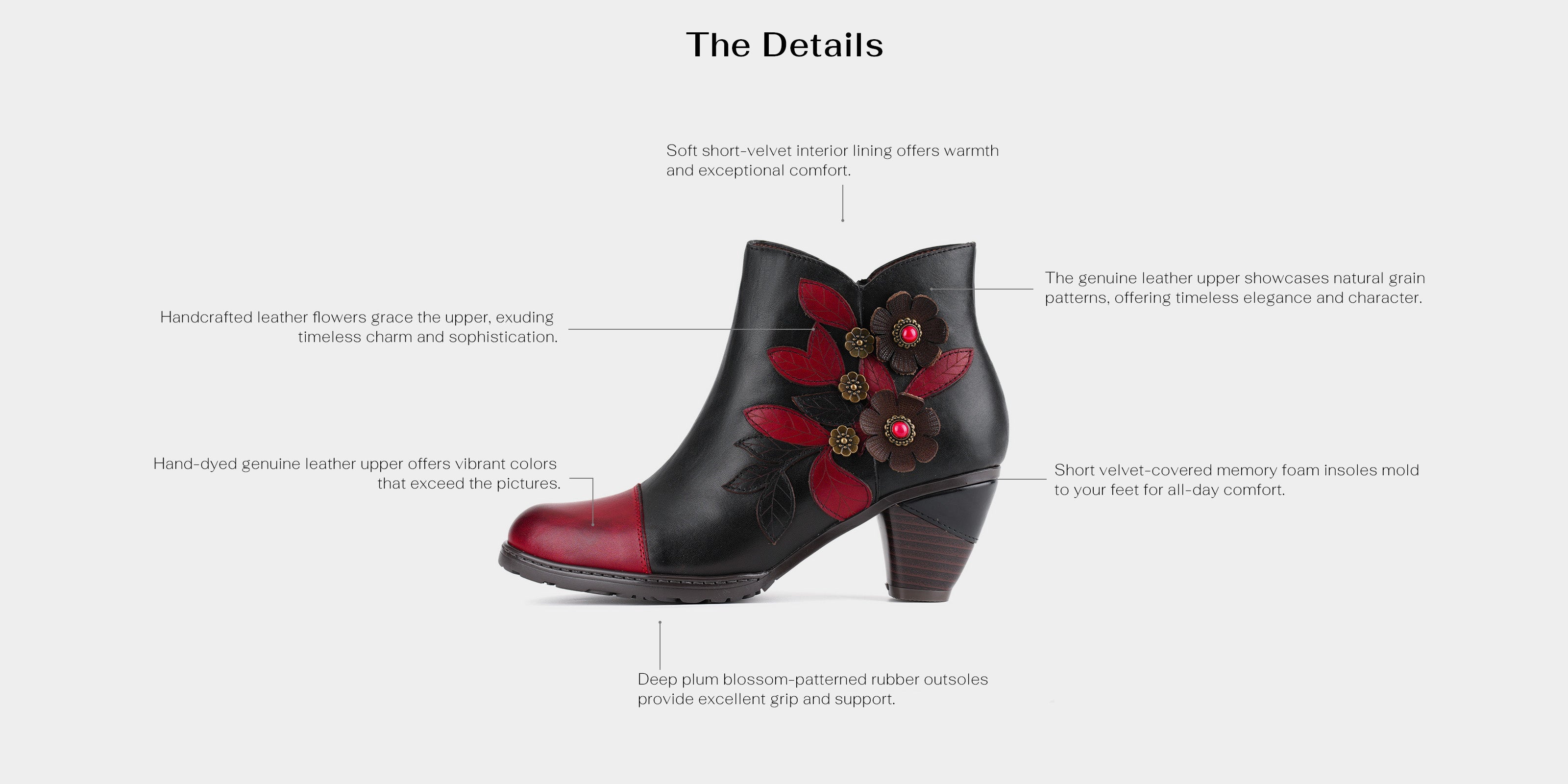 These ankle boots are inspired by classic romance with a touch of theatrical flair. The contrast of black and deep red evokes passion and strength, while the layered floral and leaf appliqués add a handcrafted, almost sculptural quality. The design channels old-world artistry, reminiscent of vintage leatherwork infused with modern creativity.