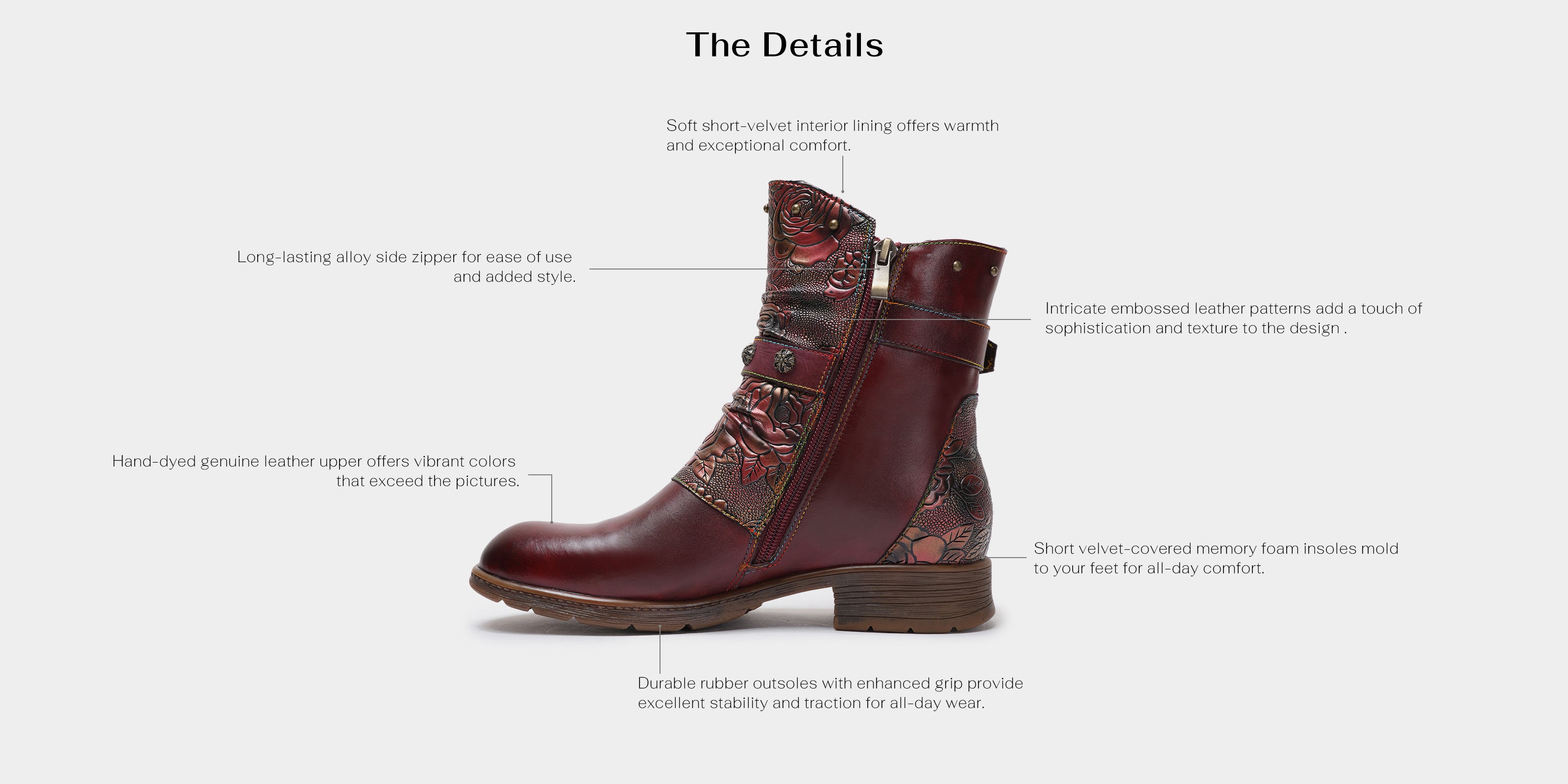 The inspiration for this boot comes from the combination of vintage art and natural flowers, creating an atmosphere of elegance and romance. The delicate rose embossed pattern on the upper symbolizes vitality and grace, paired with soft gradient hues to create a deep and captivating visual effect. The retro metal buckles and rivet decorations further highlight the craftsmanship and uniqueness of the design, as if imparting a subtle yet strong artistic aura to the wearer.
