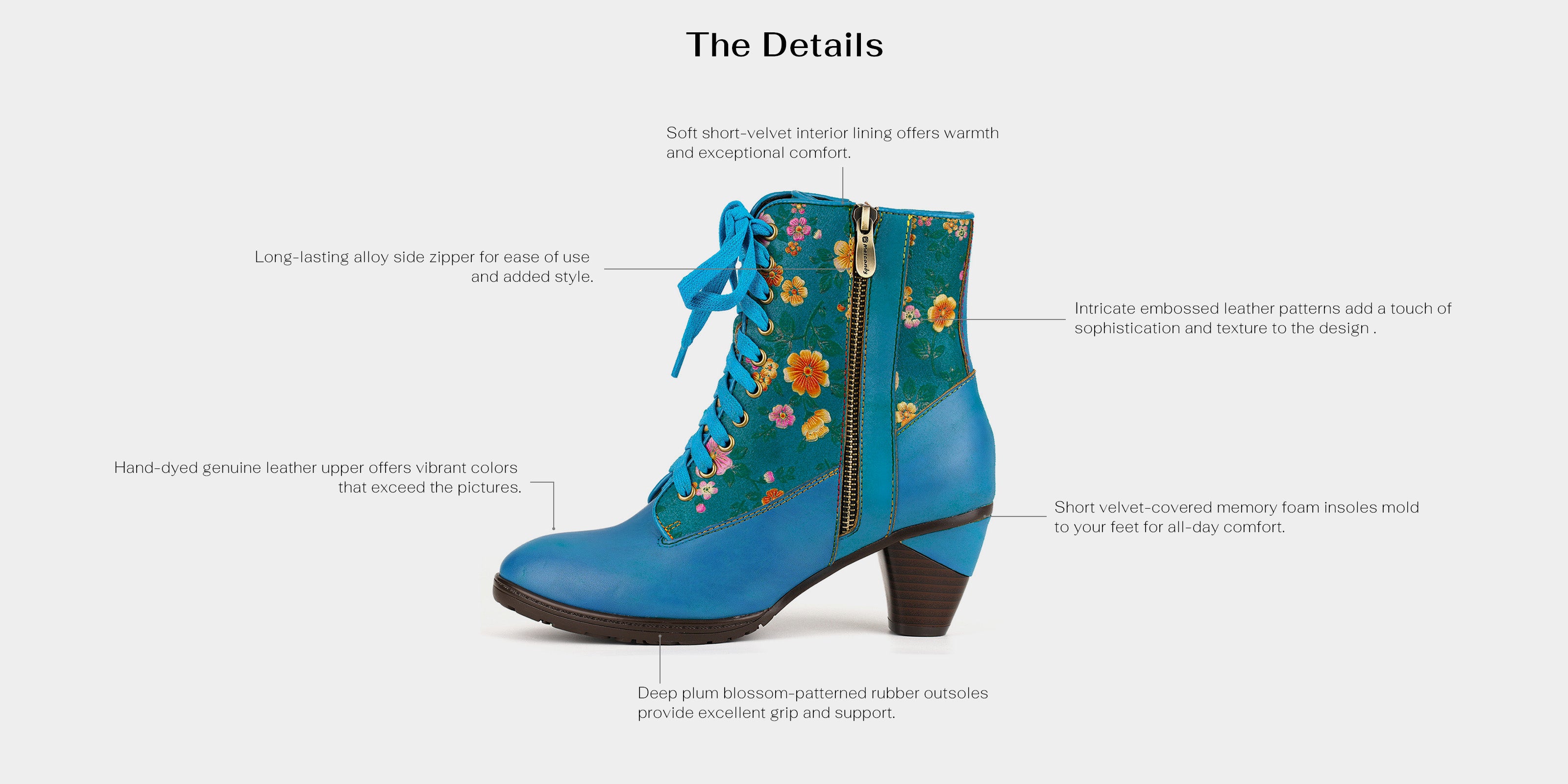 Balancing beauty and practicality, the lace-up front adds vintage charm, while the side zipper ensures easy wear. The mid-heel offers stability with elegance, making these boots ideal for both daily wear and statement looks.