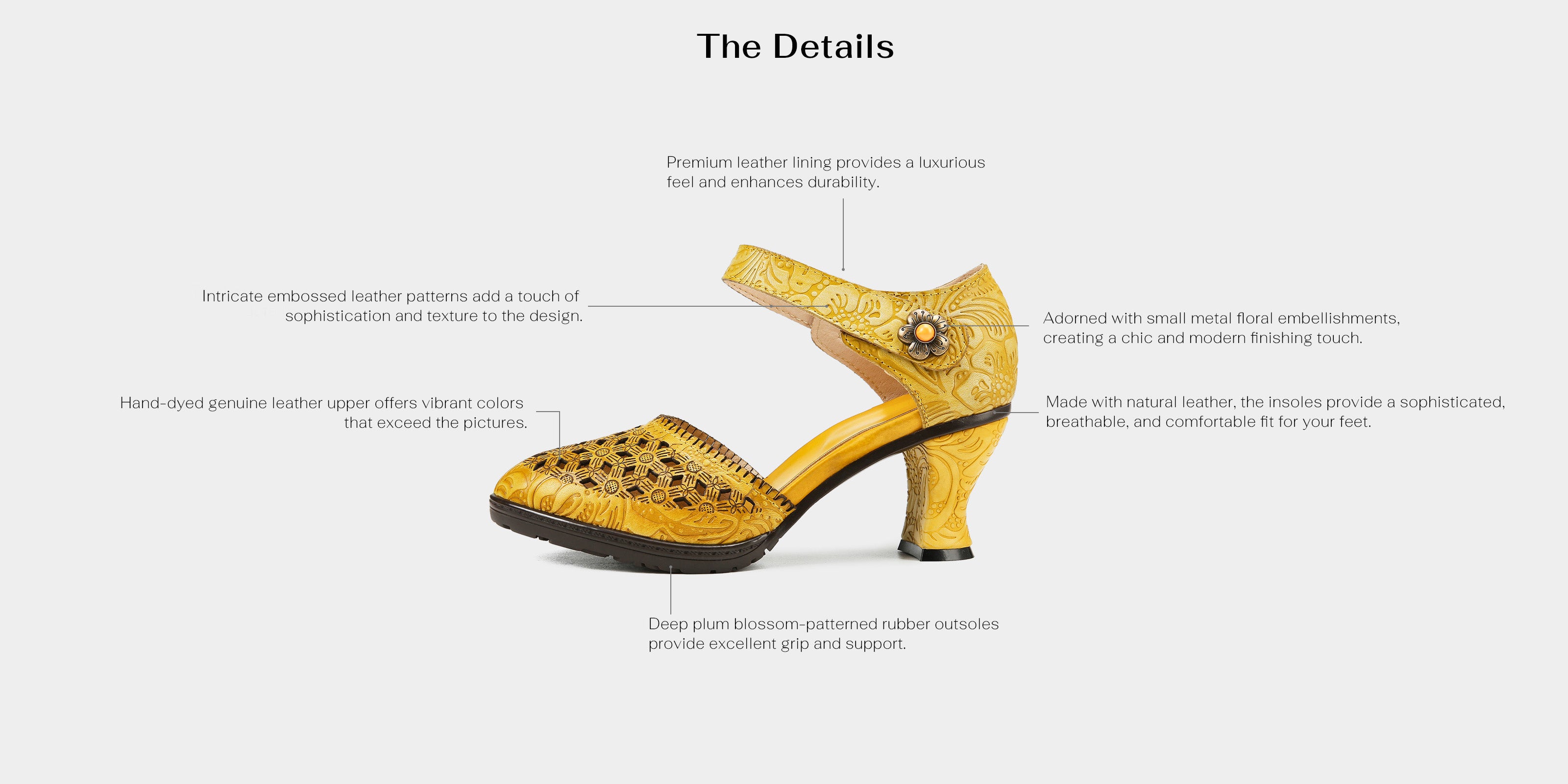These shoes feature an elegant mid-height heel combined with a retro curved design, offering both comfort and sophistication to the wearer. The upper is adorned with delicate cutouts and embossed details, enhancing breathability while highlighting superior craftsmanship. The metallic floral embellishment on the laces adds a hint of classical luxury, with meticulous attention paid to every detail.